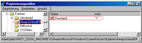 - Damit Windows die nicht benötigten DLLs wieder im Speicher beibehält, müssen Sie den Schlüssel " AlwaysUnloadDll" wiederum löschen. Klicken Sie dazu auf den Schlüssel und drücken die Taste "Entf."