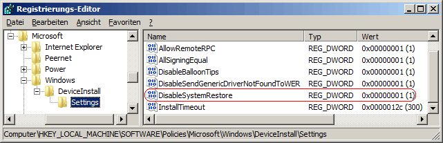 - Doppelklicken Sie auf den Schlüssel "DisableSystemRestore".