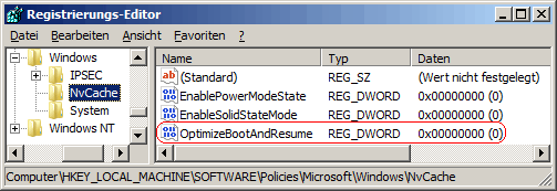 Um den Startvorgang (Bootvorgang) und die Reaktivierung aus dem Ruhezustand zu beschleunigen, verwendet das System bei Hybridfestplatten den dauerhaften (permanenten) Zwischenspeicher (Cache). Bevor das System heruntergefahren oder in den Ruhezustand wechselt, werden die Dateien festgelegt, welche im dauerhaften Speicher abgelegt werden. Dieser Vorgang verzögert das Herunterfahren bzw. den Ruhezustand etwas. Hybridfestplatten bestehen aus einer Kombination aus normaler Festplatte und einem Flashspeicher. Der folgende Schlüssel in der Registrierung schaltet die Optimierung für den Start und die Systemfortsetzung aus.