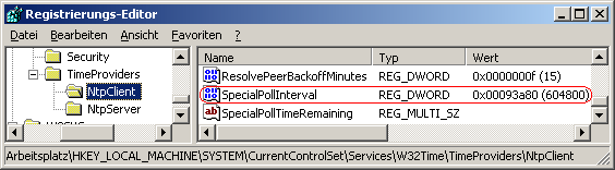 Falls die automatische Synchronisierung der Uhrzeit mit einem NTP-Zeitserver aktiviert ist, dann wird die Uhrzeit in einem bestimmten Intervall abgeglichen. Diesen Zeitabstand können Sie mit Hilfe der Registrierungsdatei beliebig anpassen. In den meisten Fällen ist es ausreichend, wenn maximal einmal täglich eine Synchronisierung der Uhrzeit erfolgt.