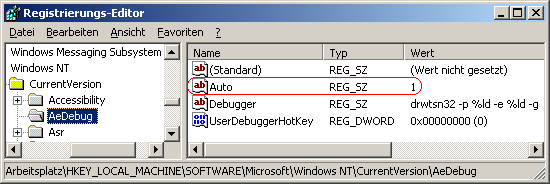 Bei einer Fehlermeldung von Dr. Watson wird normalerweise automatisch der Debugger mit gestartet. Falls der Debugger nicht benötigt wird, dann kann dieser mit dem folgenden Schlüssel in der Registrierungsdatei abgeschalten werden. Dadurch werden u.a. Zeit und Systemressourcen gespart.