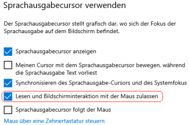 1 = Die Sprachausgabe liest alles vor, was sich unter dem Mauszeiger befindet.