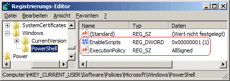 - Damit ein Benutzer mit administrativen Rechten die Skriptausführung wieder über die PowerShell-Befehle konfigurieren kann, müssen die Schlüssel "EnableScripts" und "ExecutionPolicy" wiederum gelöscht werden.