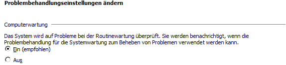 In regelmäßigen Zeitabständen wir eine geplante Diagnose des Geräts durchgeführt (auch als "Systemwartung" bezeichnet), um Systemprobleme frühzeitig zu erkennen und ggf. zu lösen. Standardmäßig ist die Diagnose für die Erkennung, Problembehandlung und Lösung konfiguriert. Die regelmäßige Überprüfung kann auch komplett deaktiviert werden. Weiterhin besteht die Möglichkeit, dass nur eine Erkennung durchgeführt wird und der Benutzer zur Fehlerbehebung aufgefordert wird.