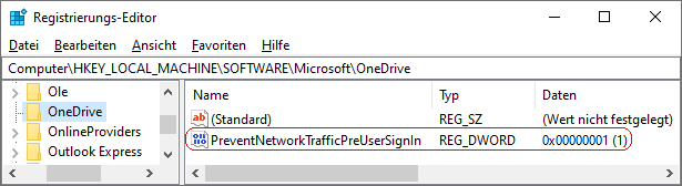 - Ändern Sie den Wert ggf. von "0" (Aktualisierung nach Benutzeranmeldung) auf "1" (Aktualisierung nach OneDrive-Anmeldung).